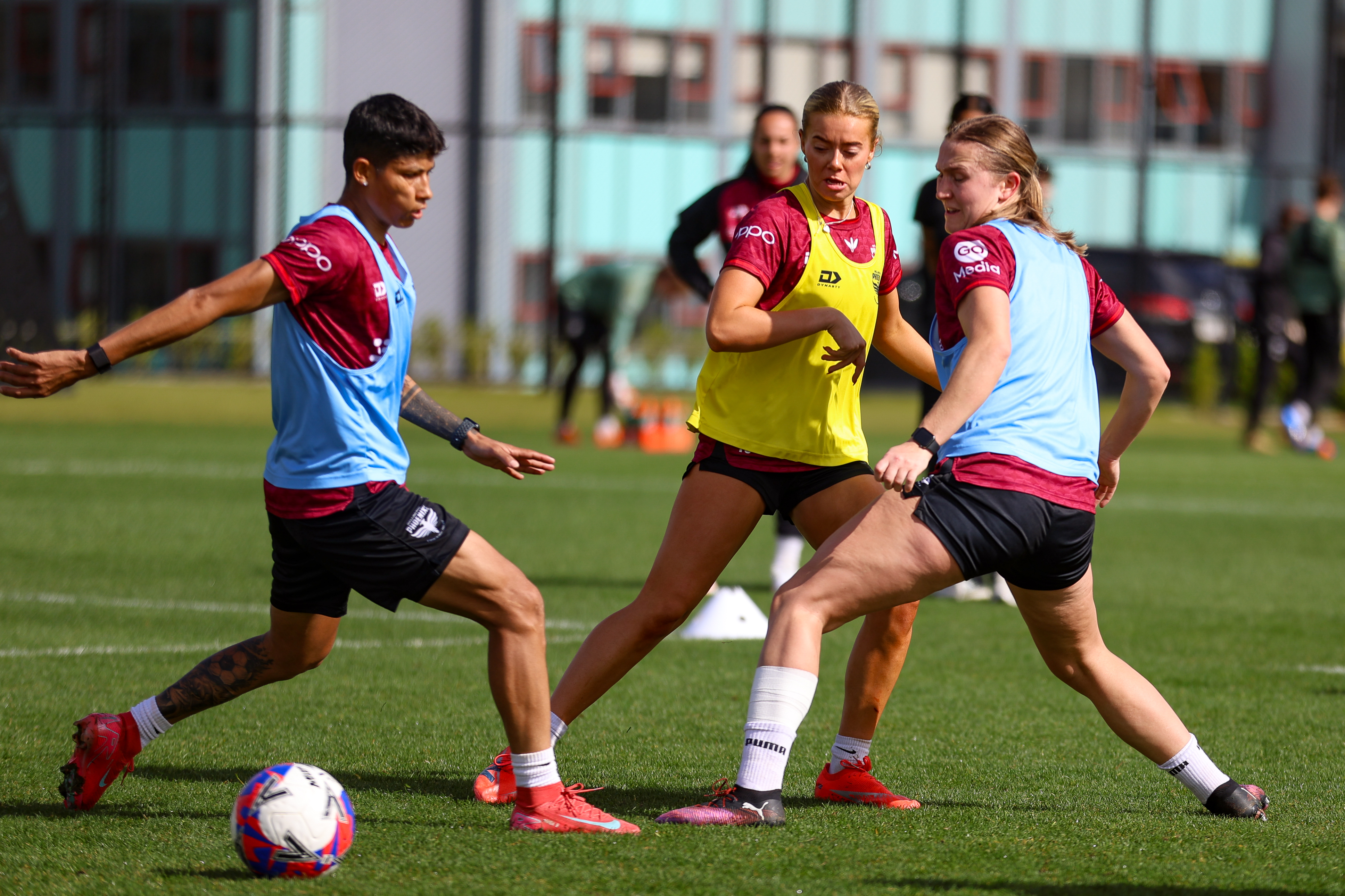 Main image: Bev Priestman gives instructions during a Wellington Phoenix training session at NZCIS. Photo: Cam McIntosh/Photomac.