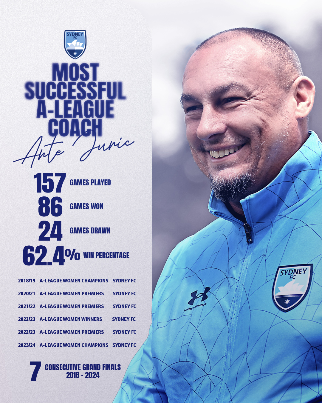 Under his leadership, Sydney FC also achieved an extraordinary run of seven consecutive Grand Final appearances between 2018 and 2024, establishing the club as the benchmark of the competition for an extended period.